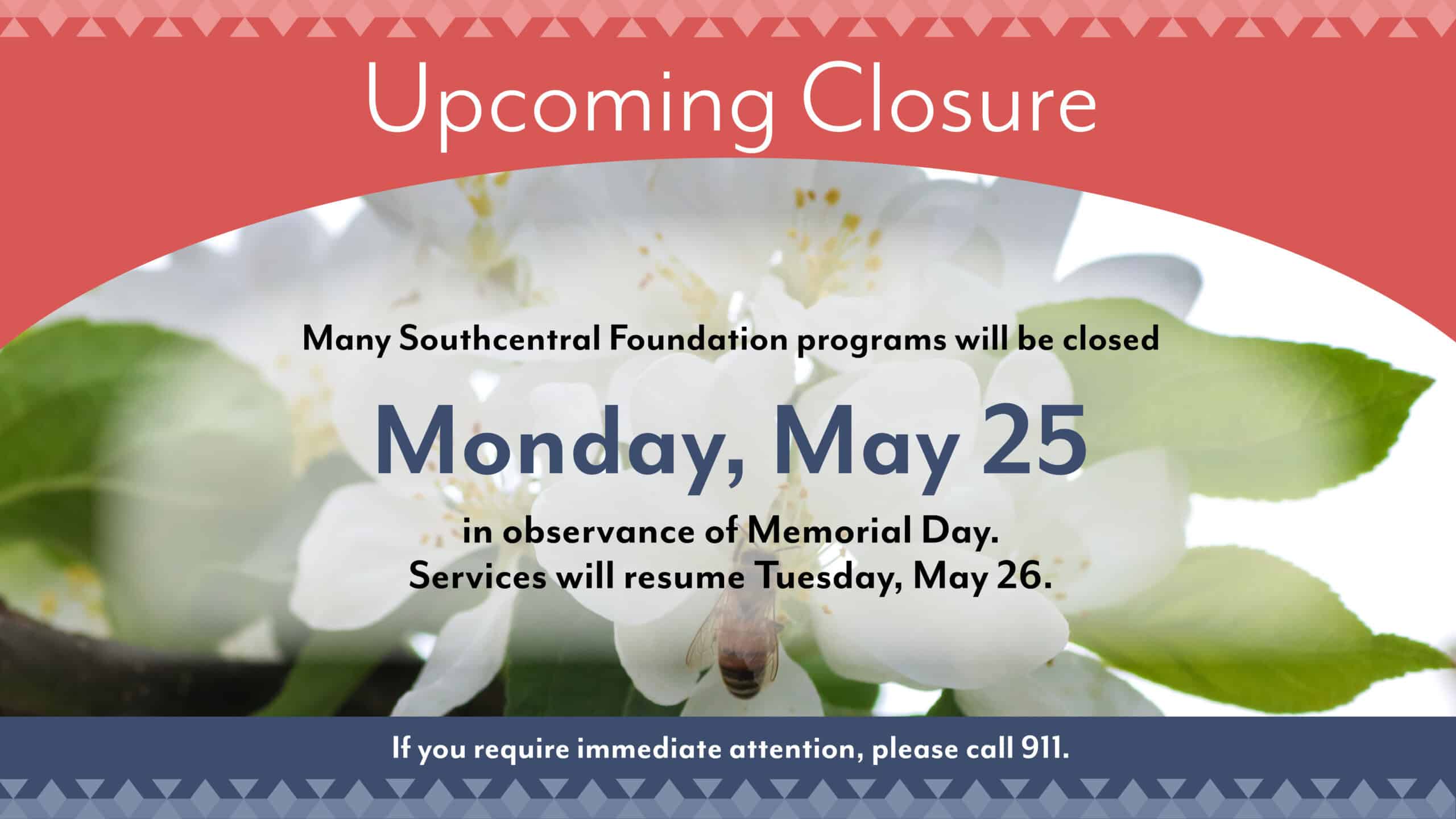 Many Southcentral Foundation programs will be closed Monday, May 25 in observance of Memorial Day. Services will resume Tuesday, May 26.